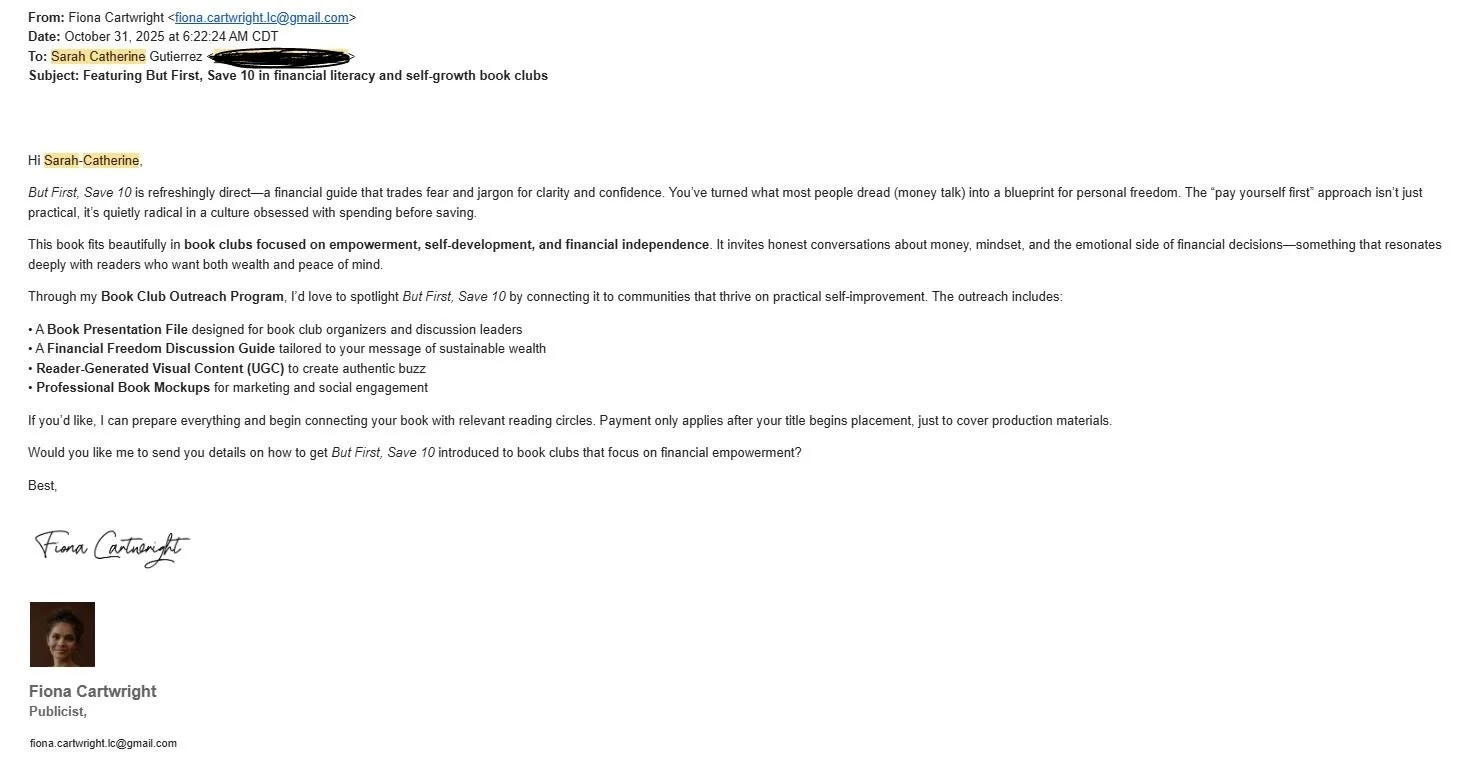 Image of email to author of But First, Save 10 Sarah Catherine Gutierrez Offering to promote her book through a book club AI Scam